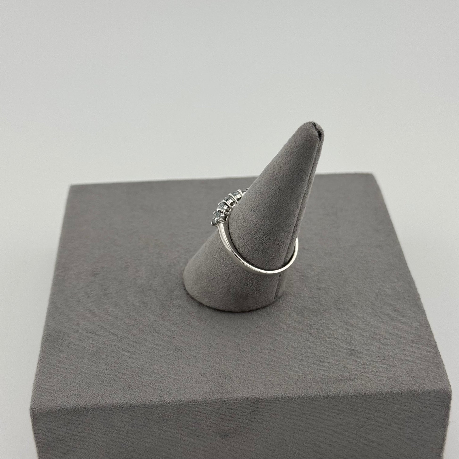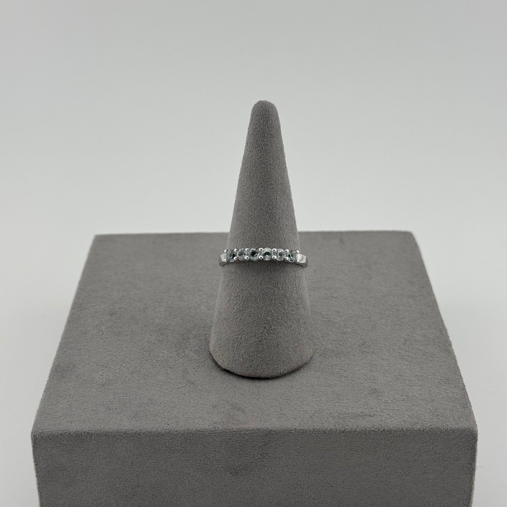 Crafted from 925 sterling silver, this piece features faceted round aquamarines set in a secure claw setting, creating a delicate yet durable band perfect for both daily wear and special occasions. Its versatile design also makes it a great stacking ring, allowing you to combine it with other silver or gemstone bands for a customized look.